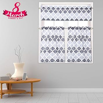 Sheer Kitchen Curtains 3pcs Valance And Tiers Set Geometric Trellis Print Linen Look Semi Sheer Cafe Curtain Set For Kitchen Bathroom Small Windows
